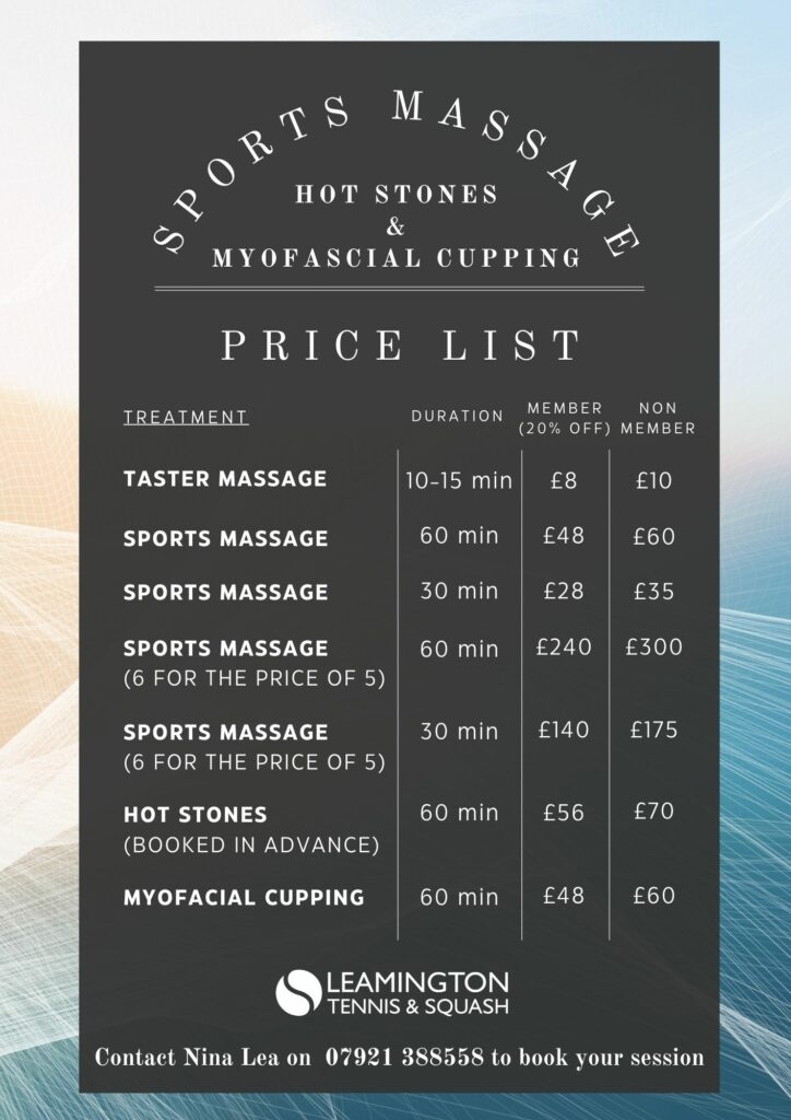 We also have a qualified sports massage professional Nina Lea on site every Tuesday between 9.00am-5.30pm (Early and late appointments available by prior arrangement). Please see the list of services offered and the prices below:
