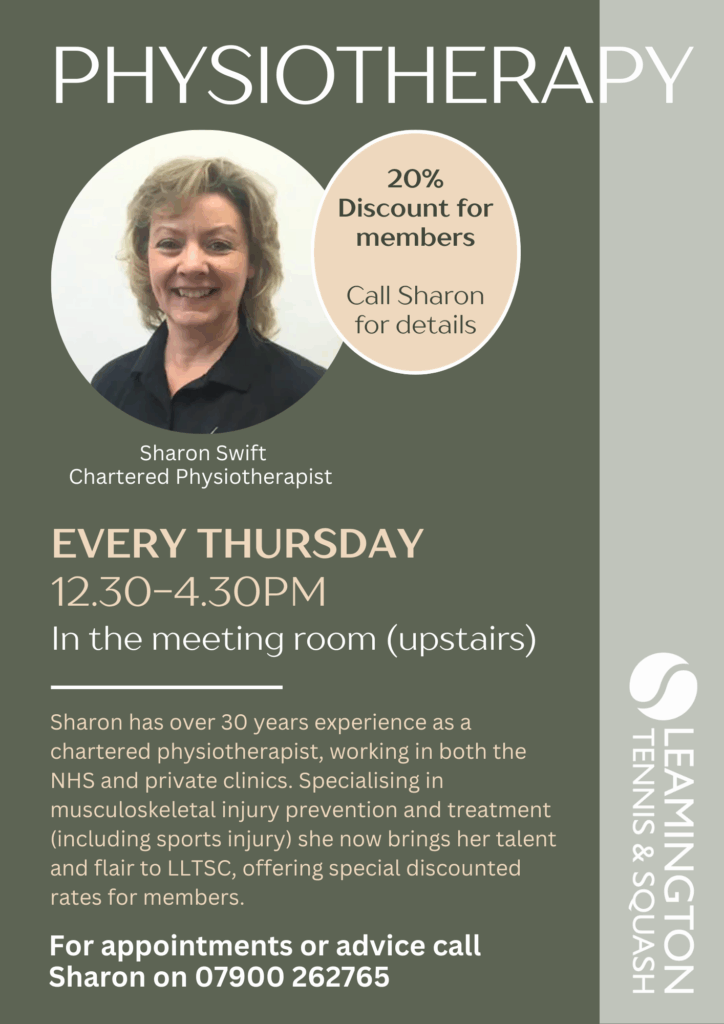 We have a chartered physiotherapist Sharon Swift on site every Thursday 12.30-4.30pm in the meeting room, Sharon specialises in musculoskeletal injury prevention and treatment and has a background covering sports injury.
